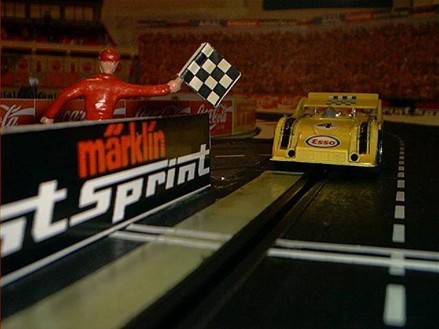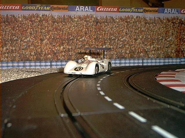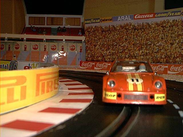 Wat het ook altijd goed doet op een vaste baan is wat publiek. Na lang zoeken vond ik op het werelwijde web twee sites waar je wat tribune- en andere achtergronden kunt downloaden, hier zijn de "links": http://www.jaeger-wachtberg.de/Tribuene.htm en http://www.slotters.de/ (klikken op "download"). Bijkomend voordeel van deze achtergronden is dat ze uit de baan vliegende auto's beletten van de tafel te ketsen.