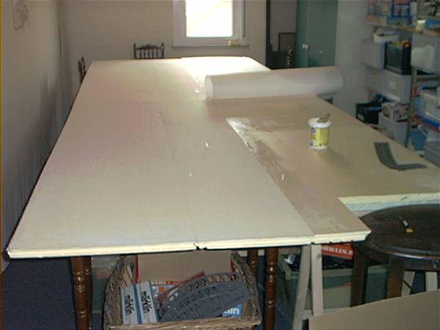 De tafel (480 cm x 180 cm) werd helemaal leeggemaakt en daarna beplakt met glasvezelbehang. Zo kreeg ik meteen een totaal nieuw oppervlak om later naar hartelust te beplakken en te beschilderen.