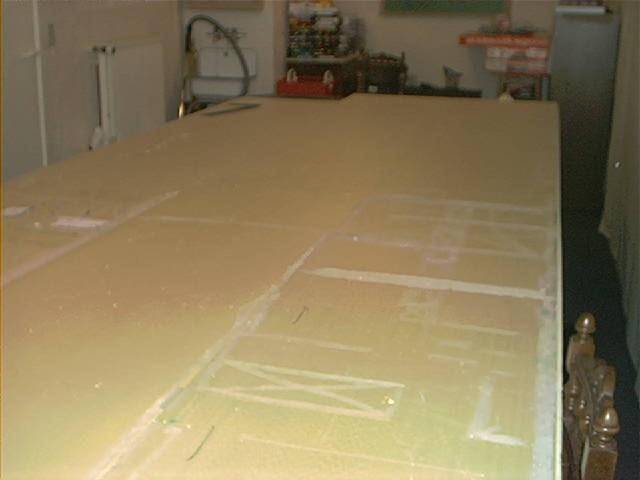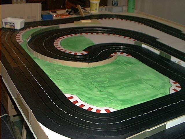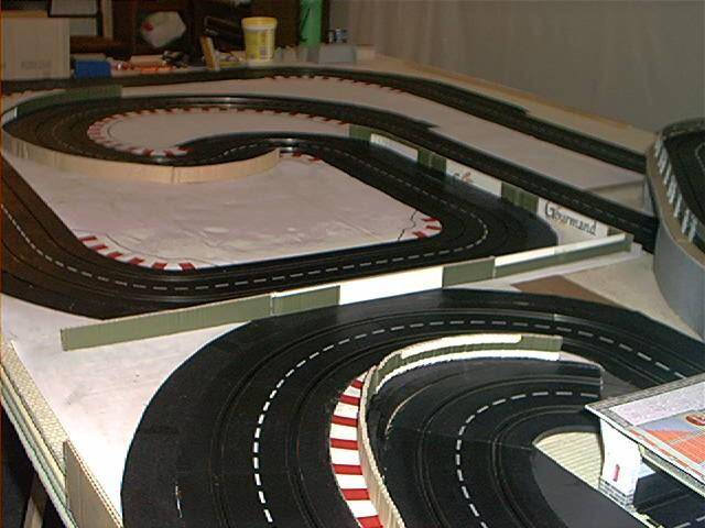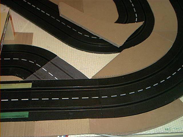 Terug naar de track, tijd nu om eindelijk eens wat werk te maken van de scenery. Ware het niet leuk om eens te werken met slipstroken, ja toch? Een hels karwei, daar heb je heel wat karton (8 mm dik), zwart, wit en rood tekenpapier en enkele emmertjes (kleine dan toch) lijm voor nodig. Oh ja... en heel veel geduld (en een goeie cutter). Het was de bedoeling om zowat heel de baan de doen verzinken in het landschap. Aan de buitenkant van de bocht moesten de zwarte slipstroken komen, aan de binnenkant de rood-witte.