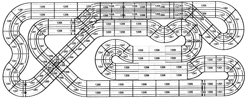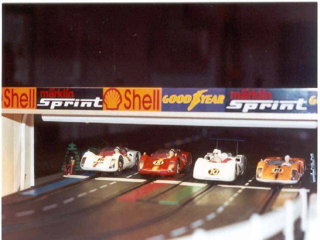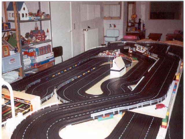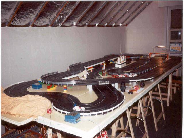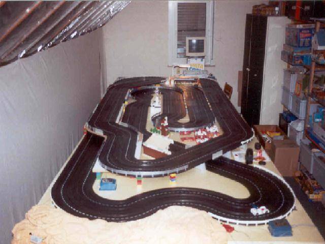 Het lange rechte stuk bovenaan is overbrugd en biedt bij het uitkomen van de tunnel net voldoende zicht om tijdig af te kunnen remmen. Elk spoor wordt gevoed door een aparte transformator. De vier rijders nemen elk plaats op de vier hoeken zodat zij tevens als baancommissarissen kunnen optreden (dit voorkomt onnodig heen en weer geloop om buitensporige wagens in het slot te houden).